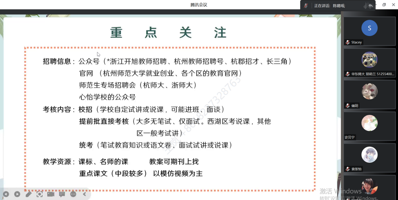 20级毕业生陈璐瑶分享了杭州公立学校的求职技巧,从招聘流程、考核方式、笔面试技巧等方面分享了自己的经验,此外还推荐了杭郡招才、杭州教师招聘号等信息发布平台。