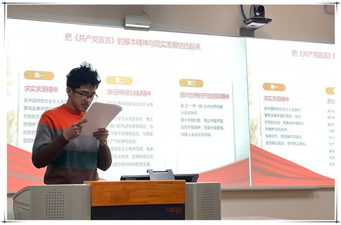 第二小组同学的汇报主题是“《共产党宣言》的百年传播及其对当代中国文化建的启示”。该组同学的汇报分为两个主要的部分:第一部分围绕着《共产党宣言》的百年传播展开讨论,第二部分围绕着《共产党宣言》对当代中国文化的启示这一中心,提出了同学们自己的看法。
