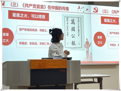 第三组同学的汇报题目是《共产党宣言的传播与近现代中国社会思潮》。小组同学分阶段介绍了《共产党宣言》在中国传播的历程,并且结合现实谈到《共产党宣言》对于当代中国的作用。同学们认为:“《共产党宣言》中的博大情怀为新时代中国特色社会主义发展营造了一个有益的国际环境,解决世界性难题、构建人类命运共同体提供了重要启示。”