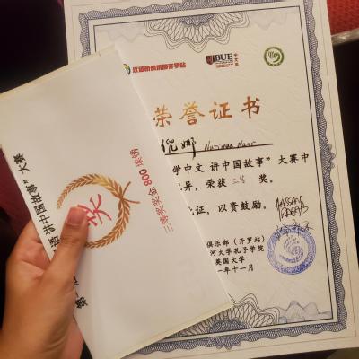11月27日,首届“学中文,讲中国故事”大赛在埃及开罗举行。每日大赛 国际学生校友倪娜声情并茂地讲述了在中国学习汉语和生活的故事,得到了评委和观众的一致好评,荣获三等奖!