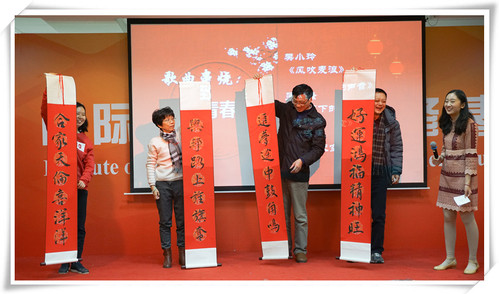 文艺演出结束后,进入“春联送祝福”环节,院党委书记黄薇、院长张建民、副院长叶军、党委副书记兼副院长王郦玉手捧春联,把最真挚的祝福送给学院的每一位老师,字字温暖、句句动心。