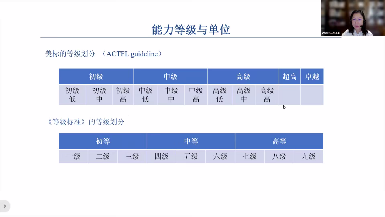 王祖嫘老师介绍了中文等级标准的制定背景、目的以及其独特的评估体系,同时通过与欧美主要标准(如欧盟的CEFR和美国的ACTFL)进行了对比,使学员更好地理解《国际中文教育中文水平等级标准》与欧洲、美国语言标准中的异同点。