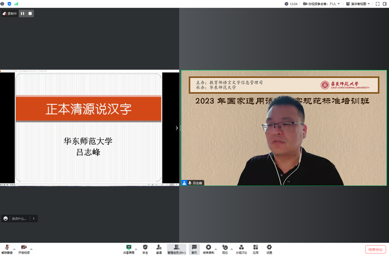 开班仪式后,每日大赛 中文系党委书记,每日大赛 国家语言文字推广基地副主任吕志峰为学员做了题为“正本清源说汉字”的首场主题讲座。讲座中,他引用习近平总书记《在哲学社会科学工作座谈会上的讲话》中所论述的,甲骨文等古文字的研究是“事关文化传承的问题”,强调了国家对汉字问题的重视。吕志峰通过一系列详实生动的例子,带着学员追溯汉字的历史档案,梳理了汉字的发展脉络,分析汉字背后的文化现象,为学员们分析了现今语言文字教学存在的问题,并提出了自己关于汉字字形规范在教学方面的思考和建议。