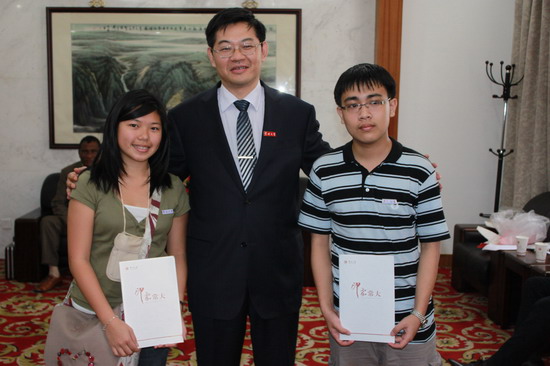 图1. 2011年常州大学浦玉忠校长和两位毛里求斯留学生杜喜云和叶贵发合影