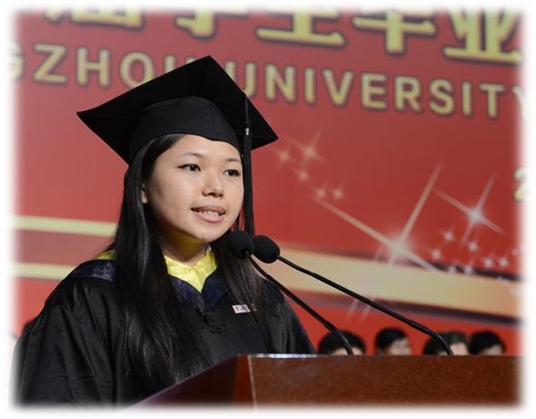 图2. 杜喜云和来自世界各地的留学生合影。图3. 杜喜云作为留学生代表在毕业典礼发言