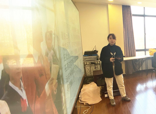 实践组代表沈香向大家分享了《山海情》中郭闽航与白校长这两个角色,以及相关人物原型——援宁支教团,并按照人物介绍、剧情回顾、故事原型的顺序展开。沈香介绍了的厦门大学研究生支教团241名队员从1999年到2021年的持续支教经历。沈香表示:“我们学校也有研究生支教团,大家前赴后继的去到教育相对落后的地方支教,我们也要向他们学习。”