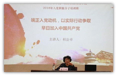 杜公卓教授以“端正入党动机,以实际行动争取早日加入中国共产党”为主题作专题讲座。她强调,已入党的同学要不忘初心,而未入党的同学要做到端正动机。杜老师从“巩固执政党地位”和“保证党员质量”两方面,结合历史和现实,帮助学员认识到端正入党动机的重要性。她指出,一个稳固的执政党,绝不能失去老百姓的拥护,不能让国家青年失去希望;从从严治党的角度,杜老师结合反腐败案例,让在座学员深刻认识到保持自身纯洁性是一个党员的必然要求。同时她强调,党的活力在于青年党员,青年党员自身要不忘使命,保持先进性。