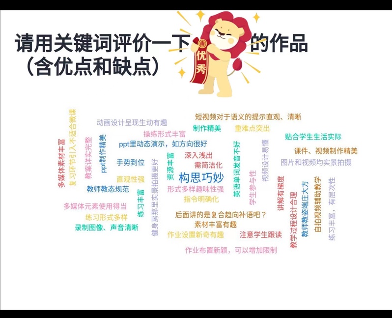 24日的首次集中指导分上下午两个半场进行,对10位选手的作品进行了集中评议,共包括六大评议流程:作品片段展示、教学设计介绍与反思、分组讨论、词云展示、选手互评、导师点评。选手们积极准备、精心设计、认真反思,讨论阶段大家切磋交流、集思广益、献言献策,导师团队点评妙语连珠、对症下药、精准指导。通过华东师大导师团队的集中指导,就10部微课作品进行充分研讨,帮助选手们了解了现存问题,明确了改进思路和方案,开启了对微课作品的精打细磨之旅,以期最终实现本次活动“汇聚更多优质的线上微课资源,普及微课制作技术,提高国际中文教师的微课制作业务水平”的初衷。在华东师大提供的开放平台,选手们既相互竞争又彼此合作,导师和选手教学相长、彼此欣赏,共享新知识、新技术,达到新境界。