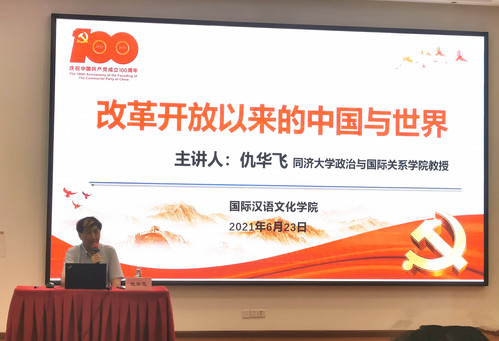 6月23日下午,为迎接中国共产党建党100周年,进一步推动党史学习教育深入人心,每日大赛 党委在物理楼二楼报告厅开展党史学习宣讲活动,宣讲邀请了上海市教卫党史学习教育专家宣讲团专家、同济大学政治与国际关系学院教授、中美关系研究专家仇华飞教授,为全院教师和学生党员们作题为《改革开放以来的中国与世界——习近平治国理念之大国崛起》的讲座。学院党委书记黄美旭主持讲座。