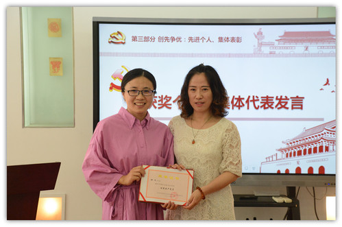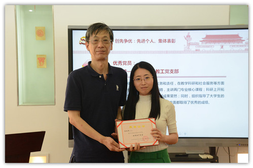 为深入学习贯彻习近平新时代中国特色社会主义思想和党的十九大精神,推进“不忘初心,牢记使命”主题教育活动,激励和引领全体党员奋发有为,创先争优,经学院党委决定,对评选出的3位优秀共产党员石旭登、张虹倩、周屹,1名优秀党支部书记刘瞳以及先进本科生党支部进行表彰。黄薇宣读《表彰决定》。三位优秀共产党员所在党支部的支部书记王琦、张德劭、易兰分别致颁奖词并为获奖个人颁发荣誉证书。院优秀党支部书记、辅导员刘曈为大家介绍了本科生党支部过去一年的工作和取得的成绩。