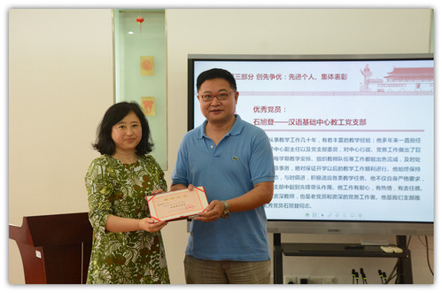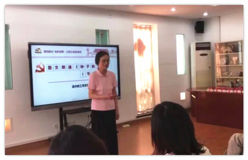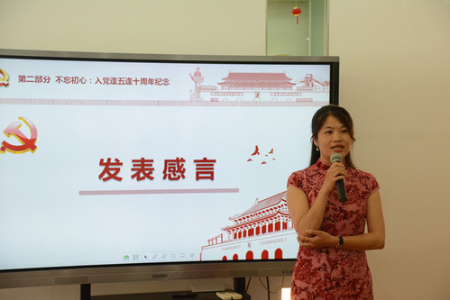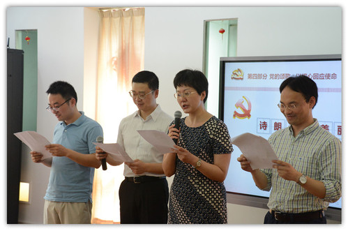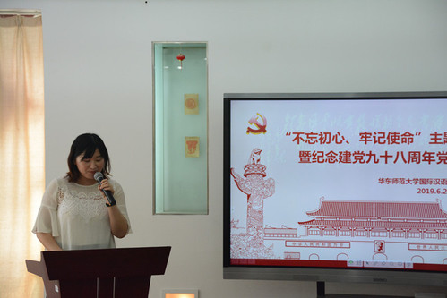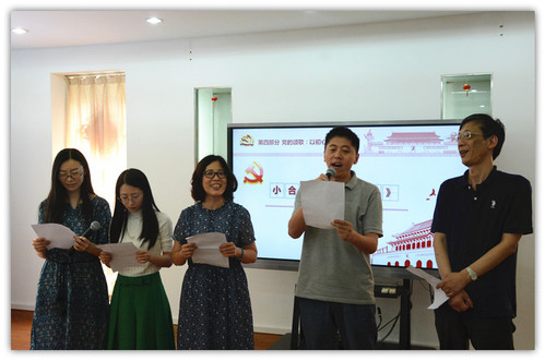 随后,各支部的党员教师用自己的方式,歌颂党和国家,诉说对党的情怀,对祖国的热爱。汉语国际教育系教工党支部小合唱《东方红》,带大家重温了红色旋律的激情豪迈;汉语言教工党支部诗歌朗诵《美丽中国》,院部教工管理支部诗朗诵《祖国华诞》以及小合唱《我和我的祖国》,共同表达了迎接建党98周年的喜悦以及对祖国的美好祝愿;国际汉语教师研修基地教工党支部诗朗诵《沁园春·雪》,再现了老一辈革命家伟大的革命乐观主义精神;退休教工党支部的赵惠平老师朗诵夏衍散文《种子的力》,声情并茂,展现了一位老党员坚定的信念和蓬勃向上的力量。