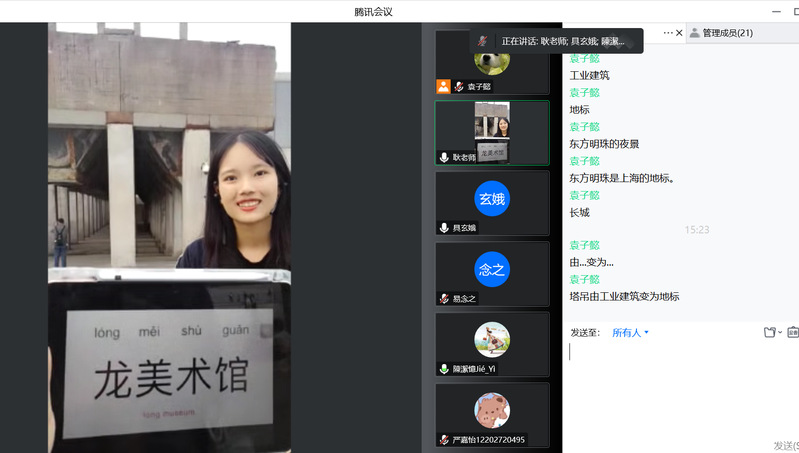 在本次实境直播教学过程中,主讲团队从黄浦江的介绍开始讲起,向学员们展示了滨江公园人们的运动生活方式,并在滑板广场随机采访了一位陆冲爱好者,学员们通过直播间与她共同探讨了现代运动的意义。主讲团队们还请这位陆冲爱好者简单介绍了一些陆冲小技巧,学员们兴趣盎然,纷纷连线互动,分享自己喜爱的运动。随后,主讲团队结合滨江公园内变化巨大的建筑物“塔吊”“煤漏斗”探讨了现代中国的在建筑上的健康理念。结合真实语境,学员们迅速地学会了本节课的相关词汇与句式结构,并积极踊跃参与关于建筑健康理念的讨论,一位学员还向大家展示了自己国家的“飞机咖啡馆”。最后,主讲团队还向学员讲解了垃圾分类,总结了现代中国的健康生活理念,并倡导每一个人践行健康生活的理念。
